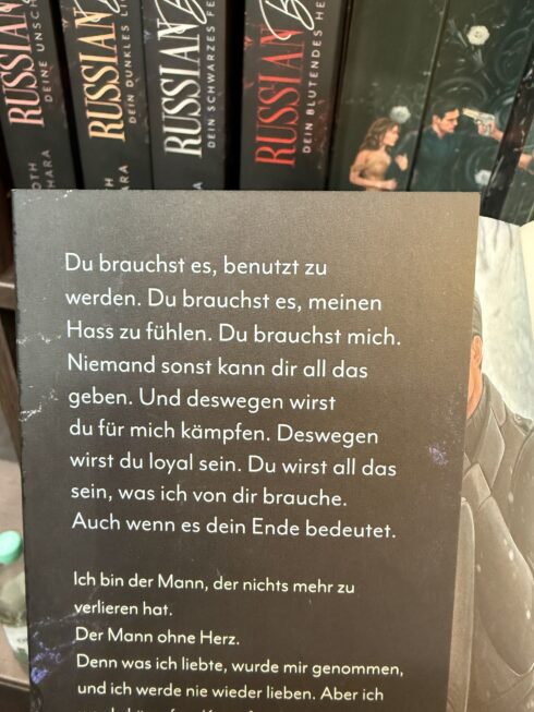 Wir können uns stattdessen gerne auf die anderen problematischen Aspekte von Dark Romance fokussieren. Zum Beispiel, dass die Protagonistin wie hier in „Russian Blood“ schon auf der Rückseite in literarisch billiger Weise manipuliert wird.